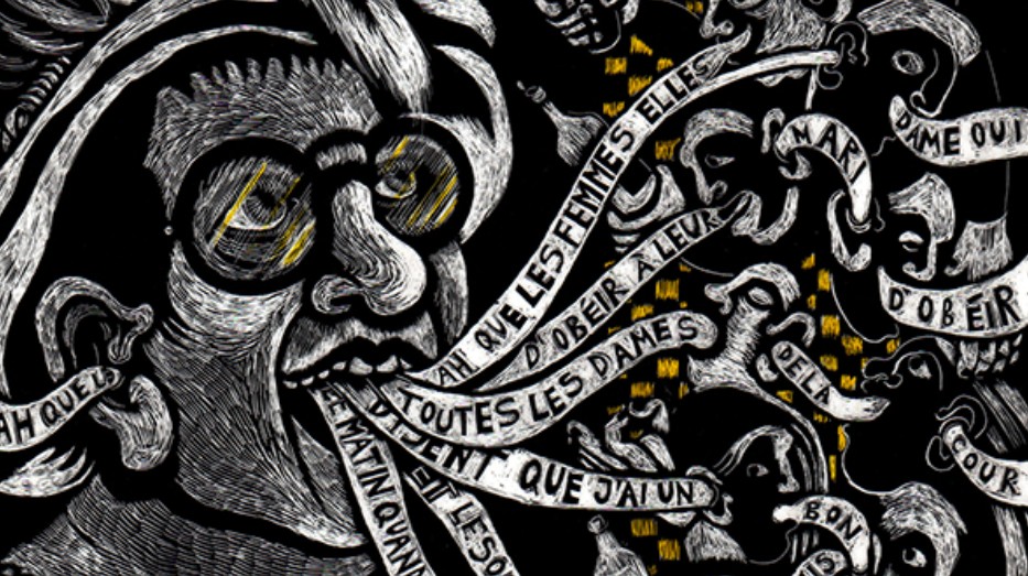 Mon identité graphique s’exprime la plupart du temps par des techniques de soustraction, par exemple à travers le scratchboard, dans lequel je gratte le noir pour faire surgir les images qui hantent mon univers.