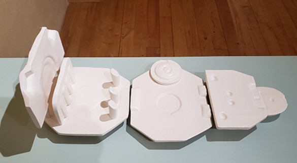 Ici, l’objet proposé par les artistes ne sert pas à en produire un autre. Il documente des gestes, une méthode, un savoir-faire. Les moules reproduits en faïence et cuits en un seul bloc unissent et cèlent les différentes parties des moules originels et annulent donc la fonction matricielle du moule.